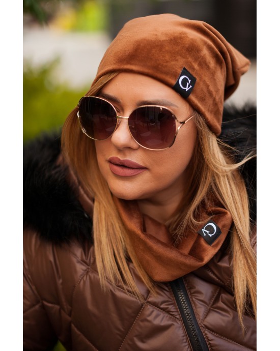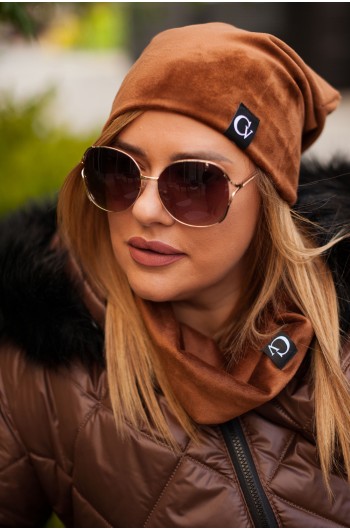 WELUROWY Komplet - czapka i komin w kolorze brązowym