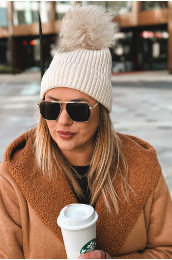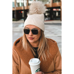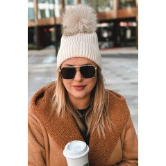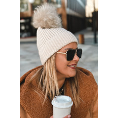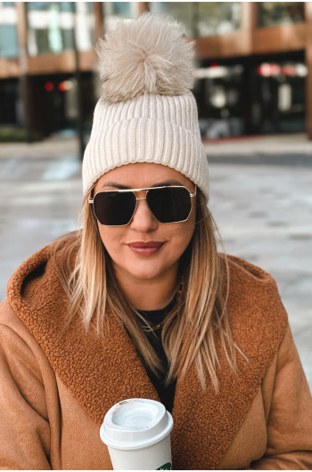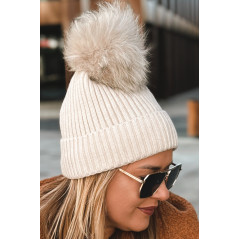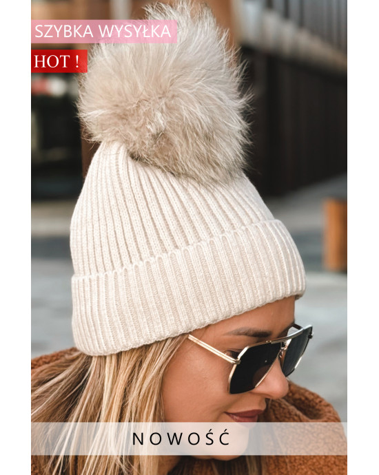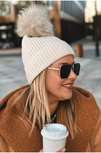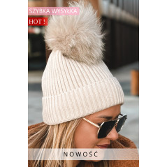 prążkowanej dzianiny. U góry zdobi ją duży, puszysty pompon w tonacji ecru.