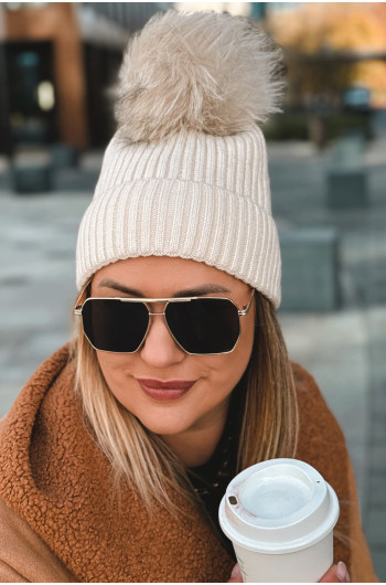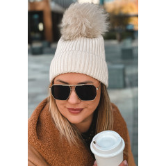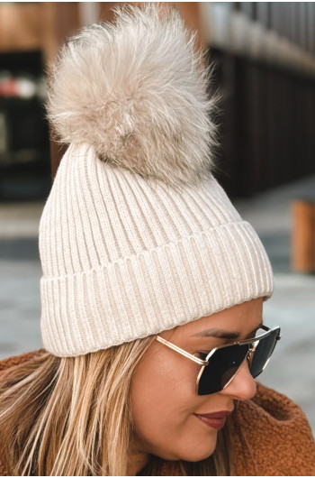 Czapka z odpinanym pomponem w kolorze beżowym