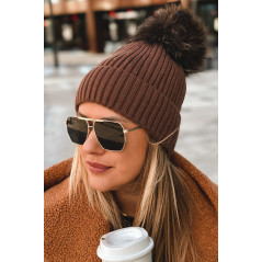 prążkowanej dzianiny. Zdobiona dużym, puszystym pomponem w odcieniach brązu.