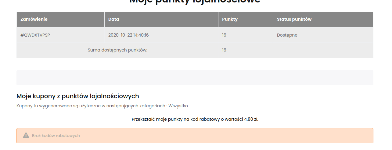 Po potwierdzeniu prośby o przekształcenie mamy na dole tabelę z kodem, który możemy skopiować i wprowadzić podczas składania zamówienia. Kod pojawi się również w koszyku z możliwością jego użycia bezpośrednio na obecne zamówienie!