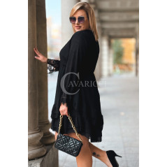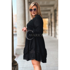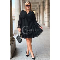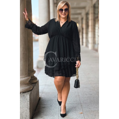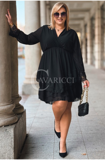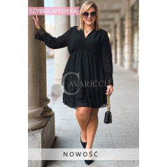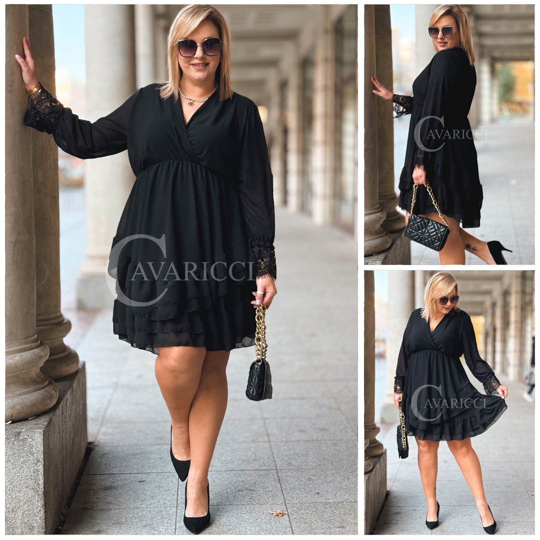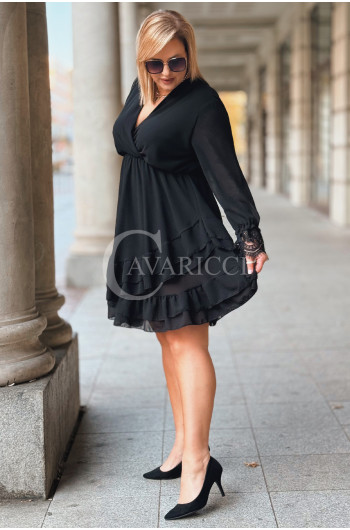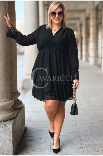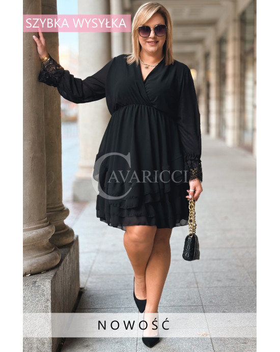ALDA – romantyczna sukienka z kopertowym dekoltem, koronką i podwójną falbanką w kolorze czarnym