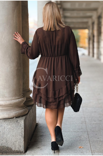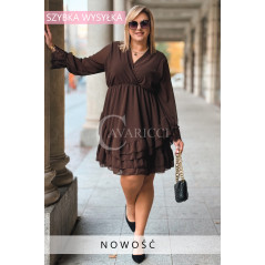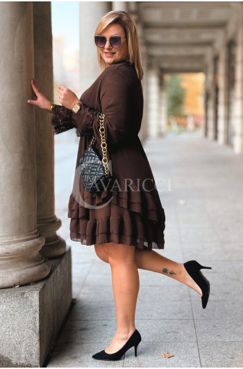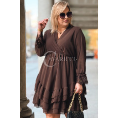 ALDA – romantyczna sukienka z kopertowym dekoltem, koronką i podwójną falbanką w kolorze brązowym