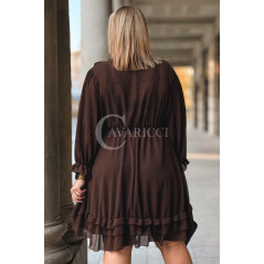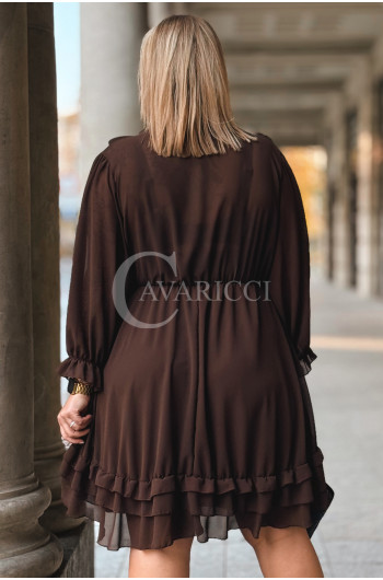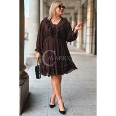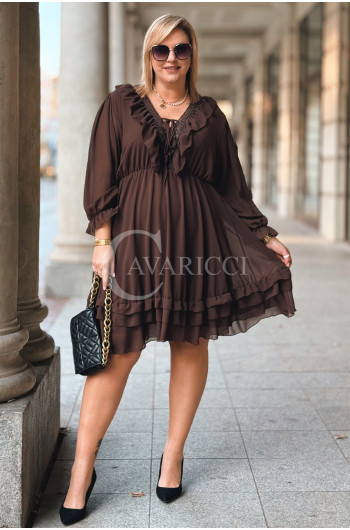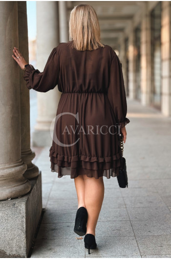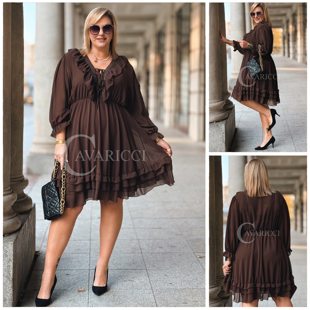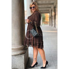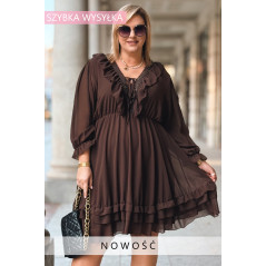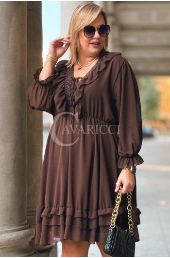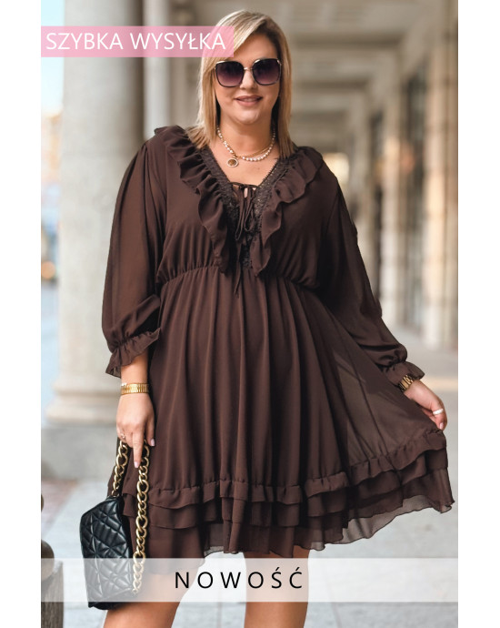 KAJA – romantyczna sukienka z kopertowym dekoltem, falbankami i koronkowym wykończeniem w kolorze brązowym