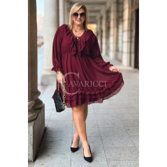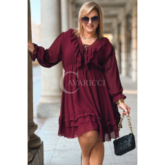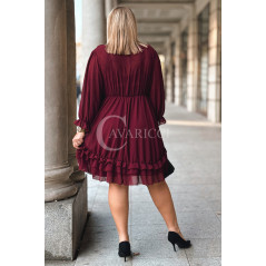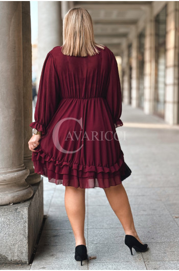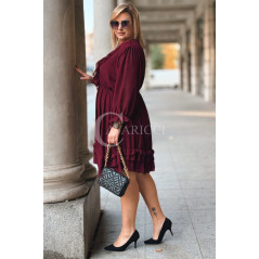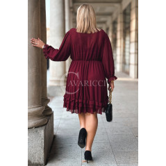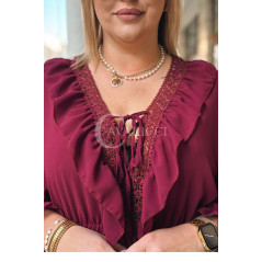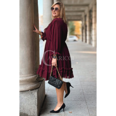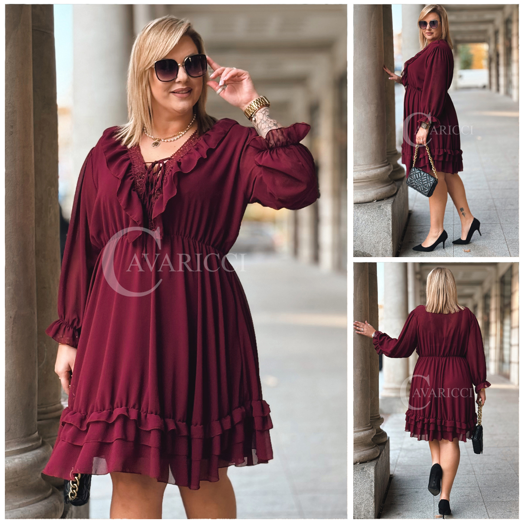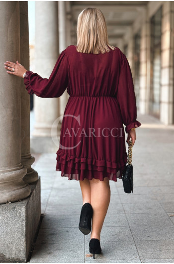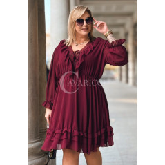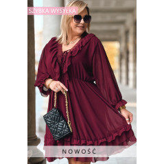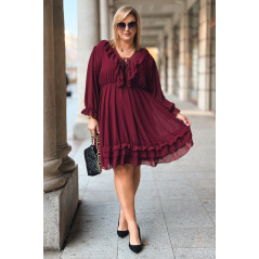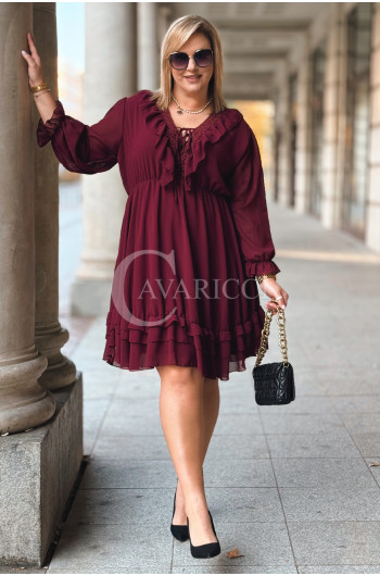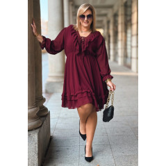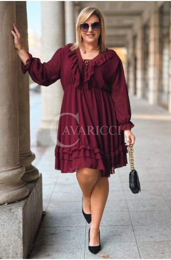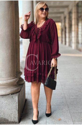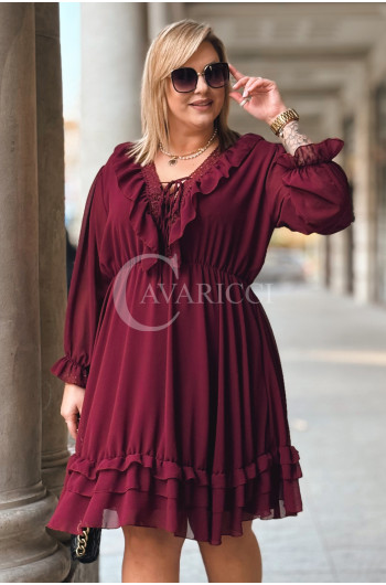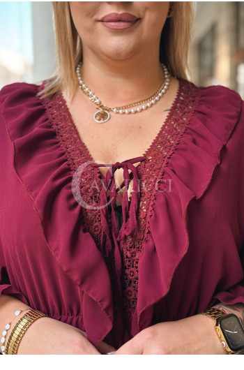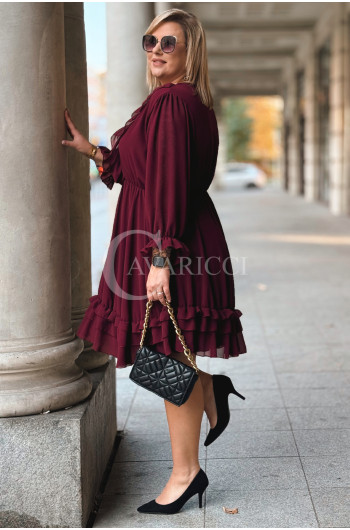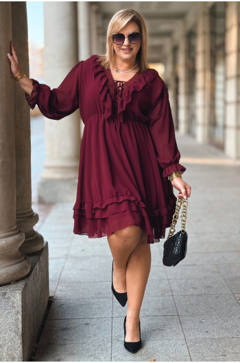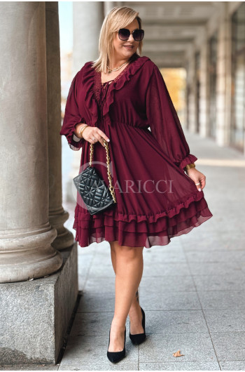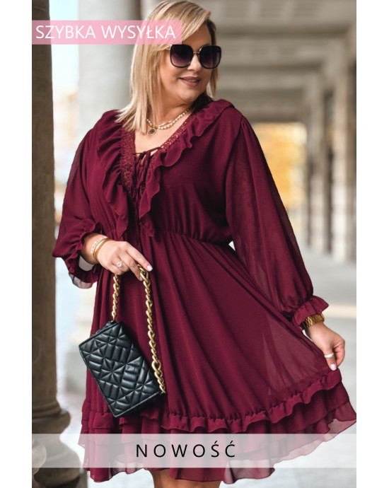 KAJA – romantyczna sukienka z kopertowym dekoltem, falbankami i koronkowym wykończeniem w kolorze bordowym