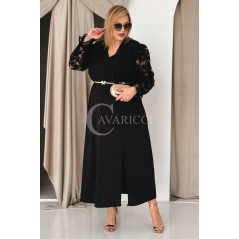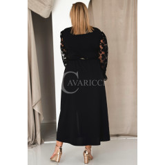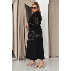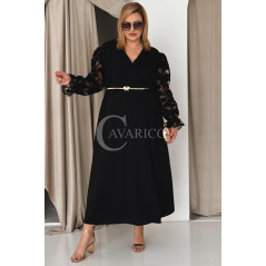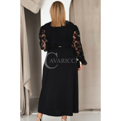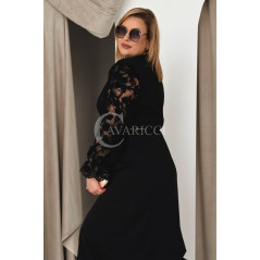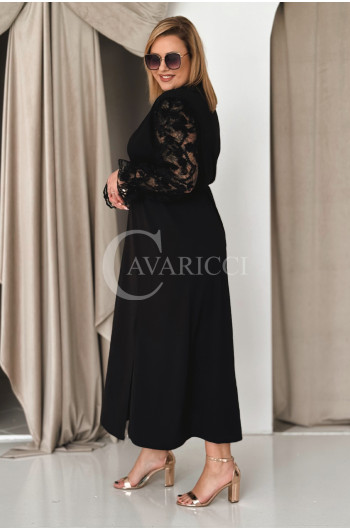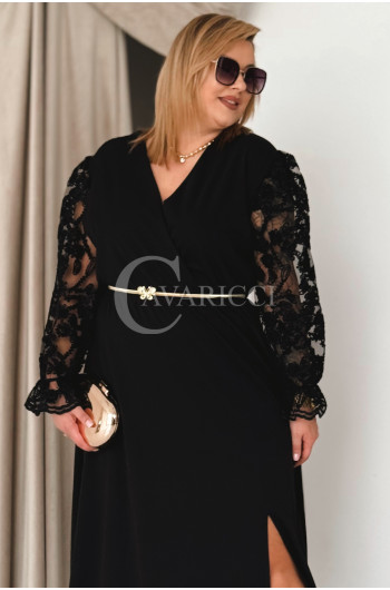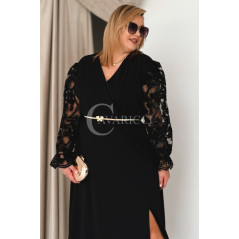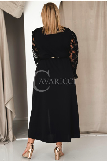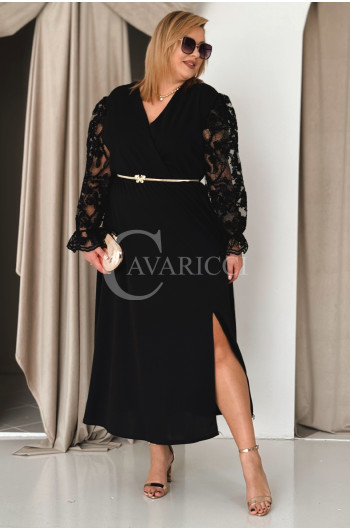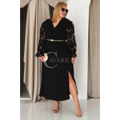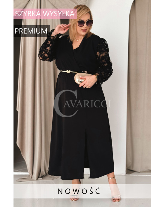 CARLOTTA - Czarna elegancka sukienka z koronkowymi rękawami i złotym paskiem