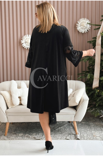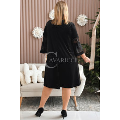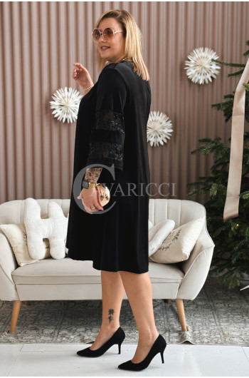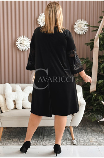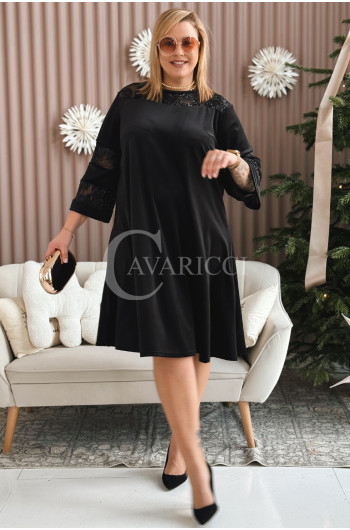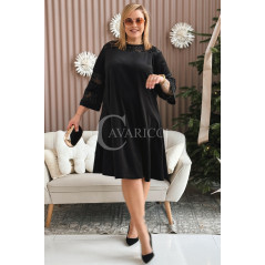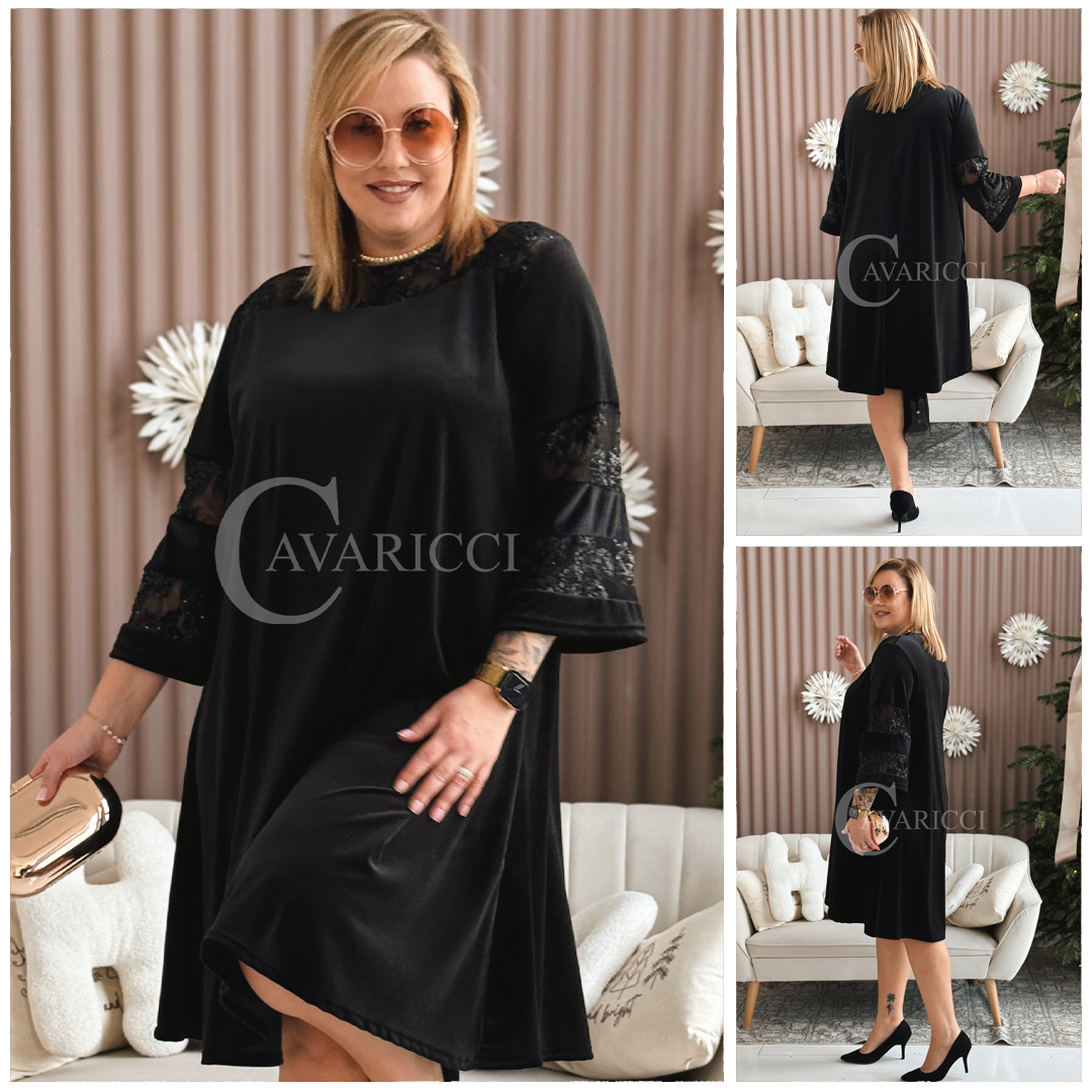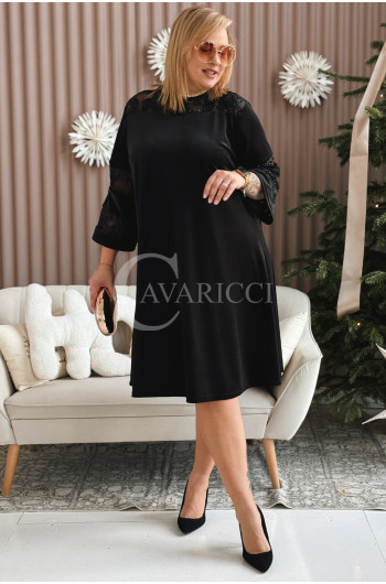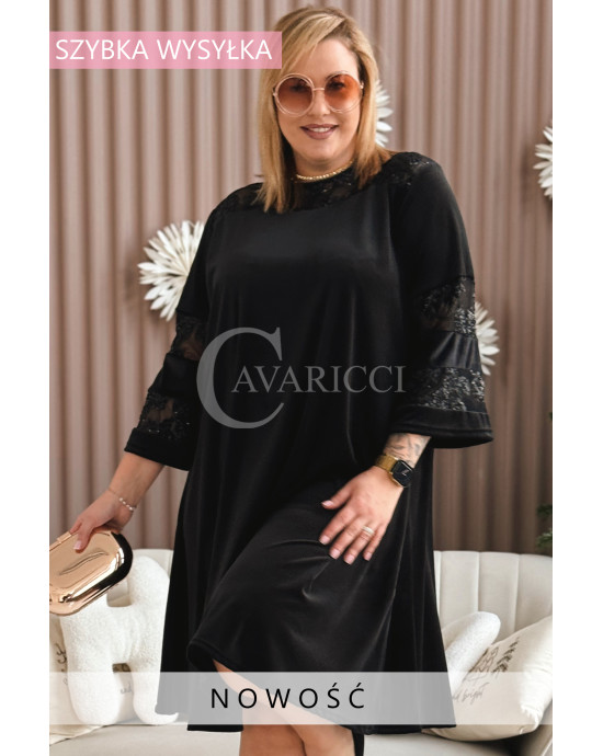 VERONELLA - Trapezowa midi welurowa sukienka z koronką w kolorze czarnym