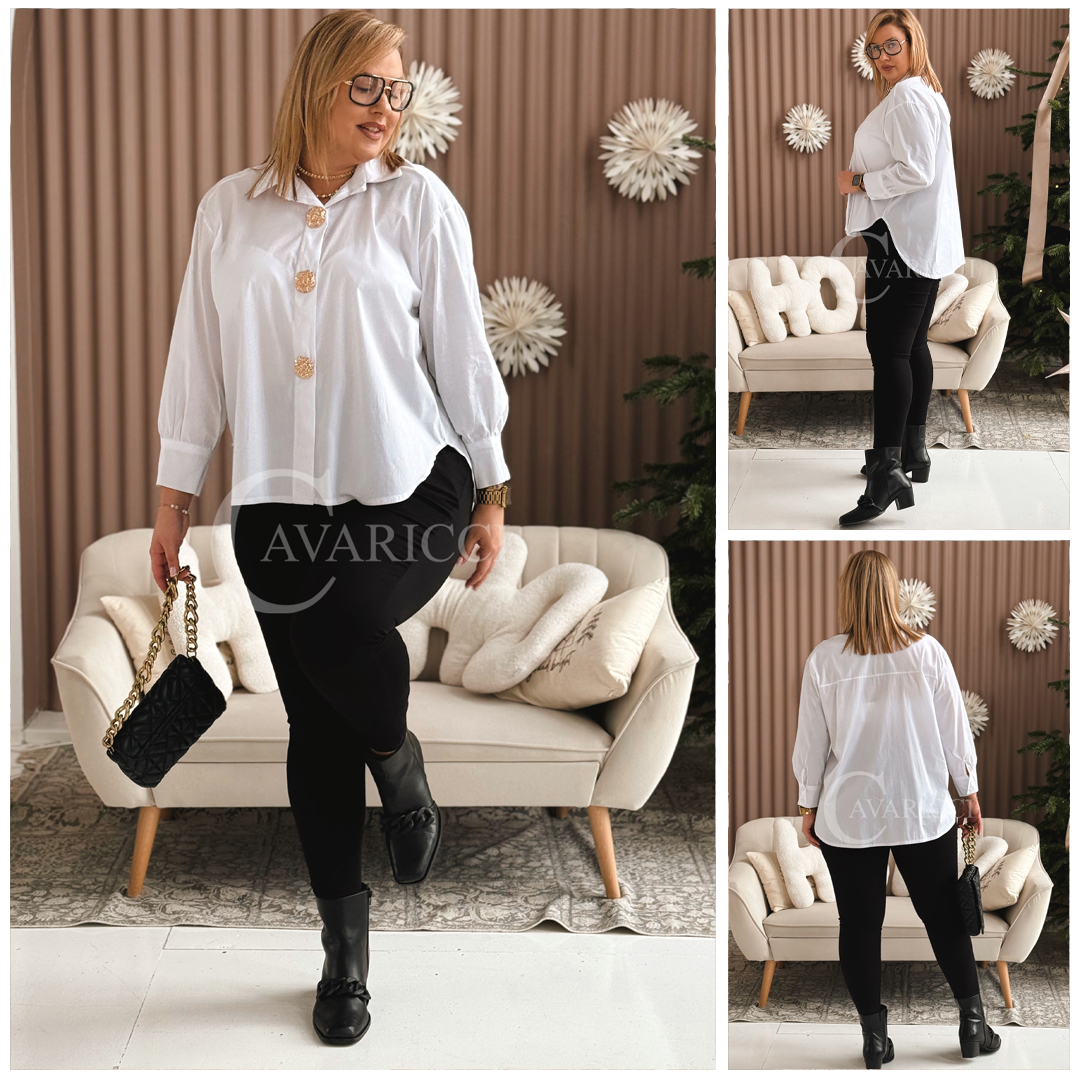 💌 VITTORIA - klasyczna koszula z dużymi złotymi broszkami, która łączy elegancję z luksusowym charakterem.