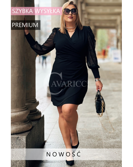 💃 ELEGANZA - CZARNA SUKIENKA Z PRZEKŁADANYM DEKOLTEM I TIULOWYMI RĘKAWAMI