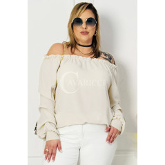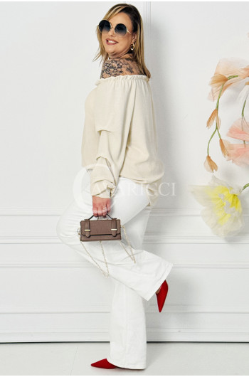 Model AMORE posiada elastyczny dekolt oraz marszczone rękawy, dzięki czemu ładnie dopasowuje się do różnych sylwetek i zapewnia swobodę ruchów.