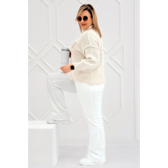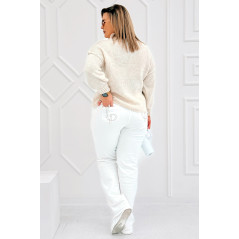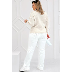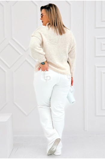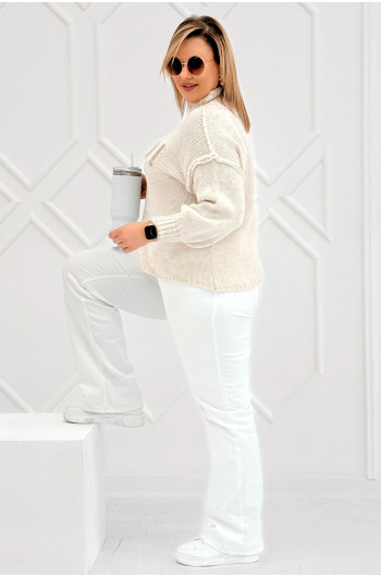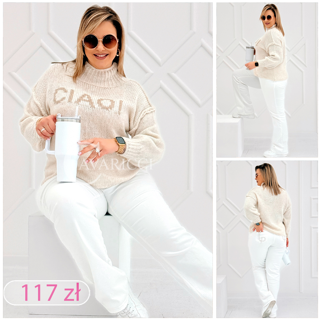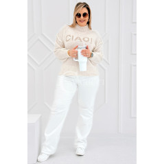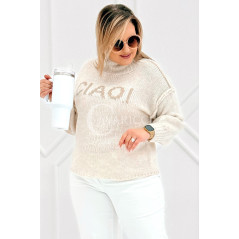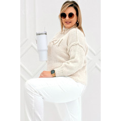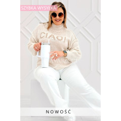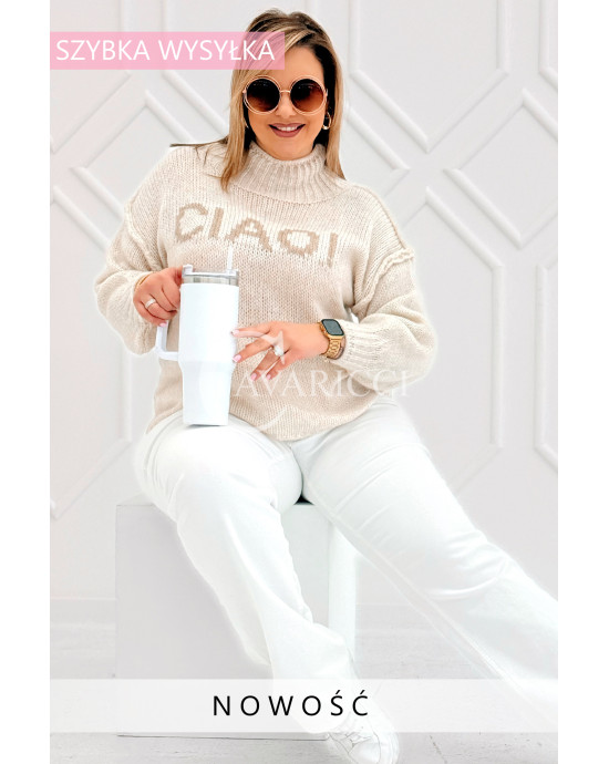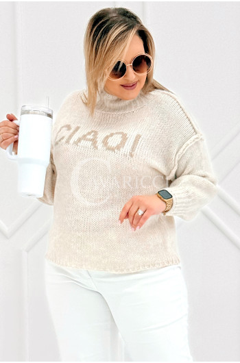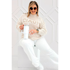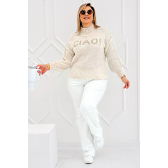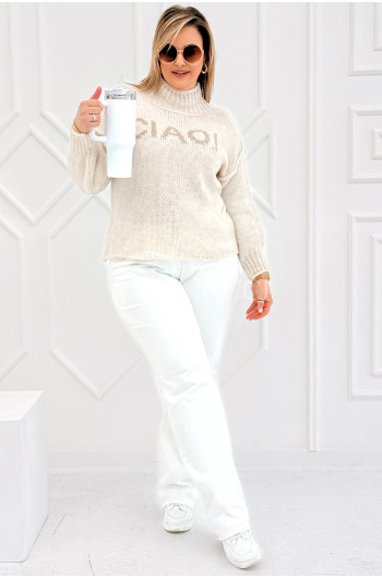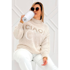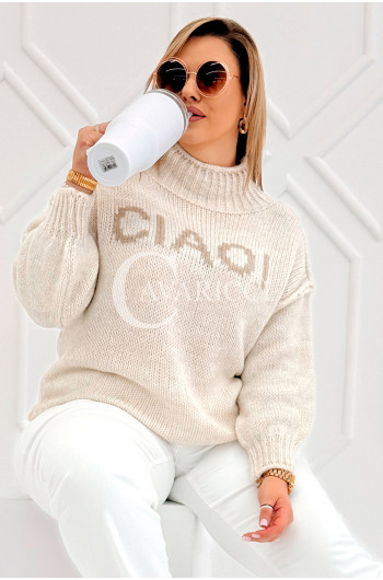 CIAO - Stylowy sweter zdobiony napisem z półgolfem i ozdobnymi przeszyciami w kolorze beżowym