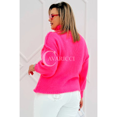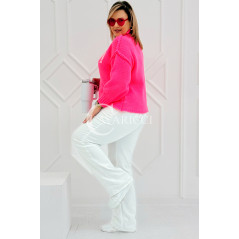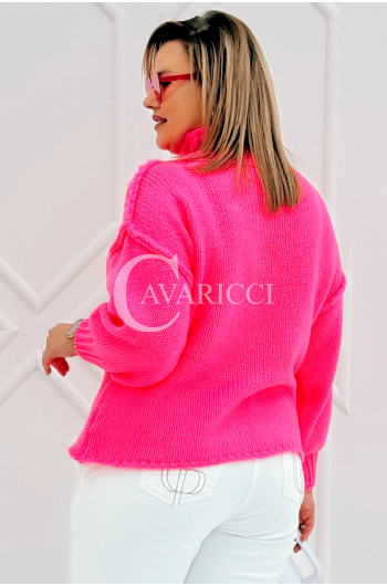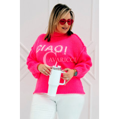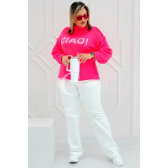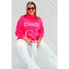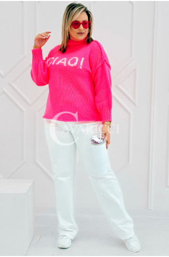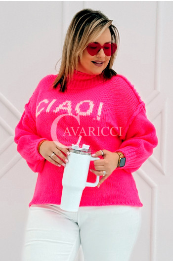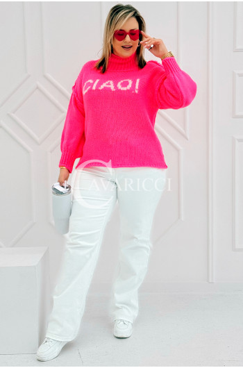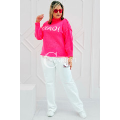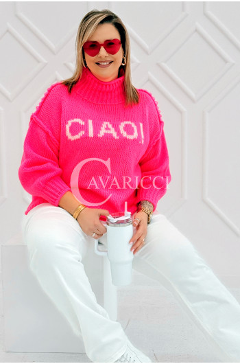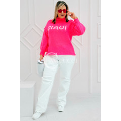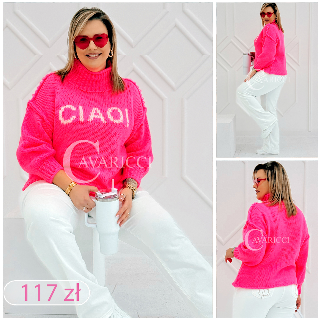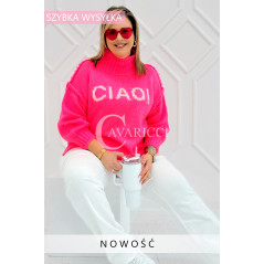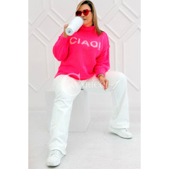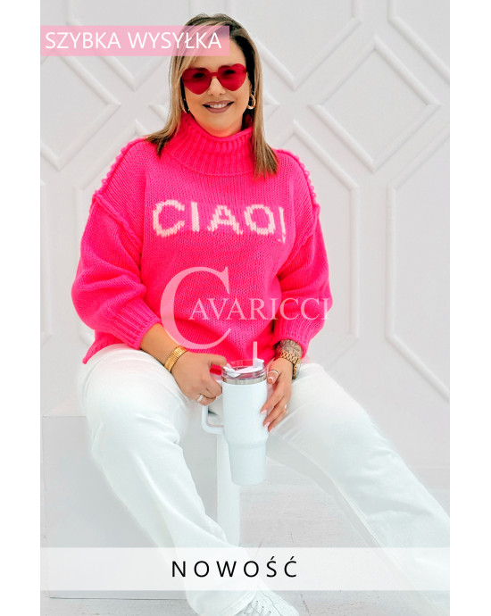 CIAO - Stylowy sweter zdobiony napisem z półgolfem i ozdobnymi przeszyciami w kolorze landrynkowym