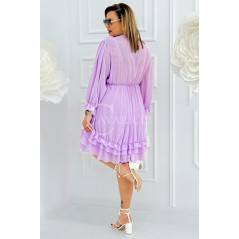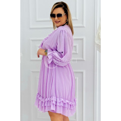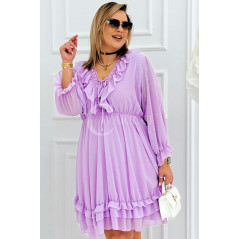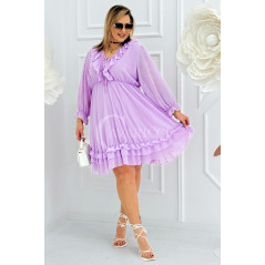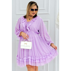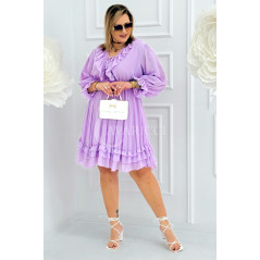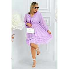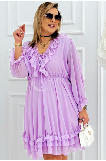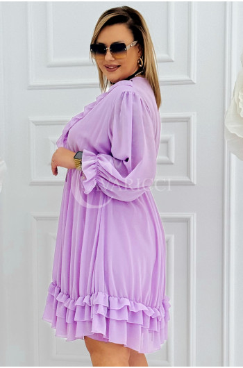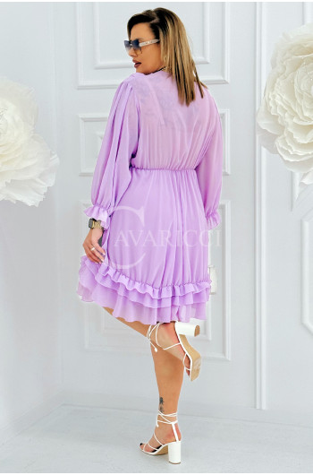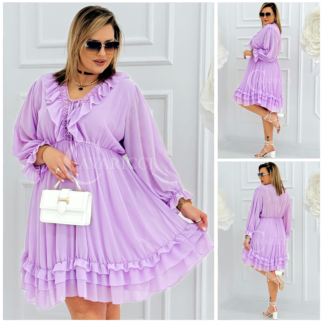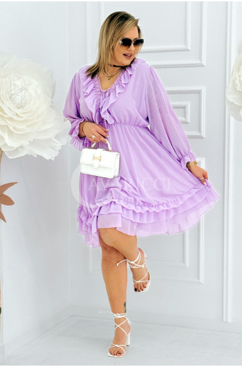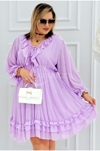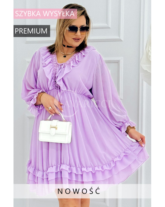 KAJA – romantyczna sukienka z kopertowym dekoltem, falbankami i koronkowym wykończeniem w kolorze liliowym