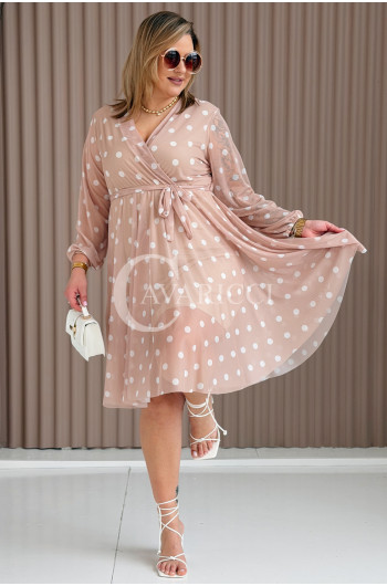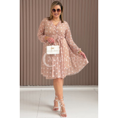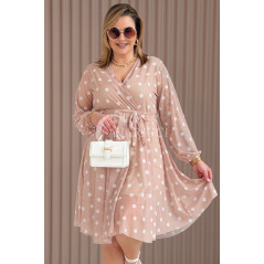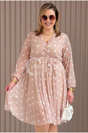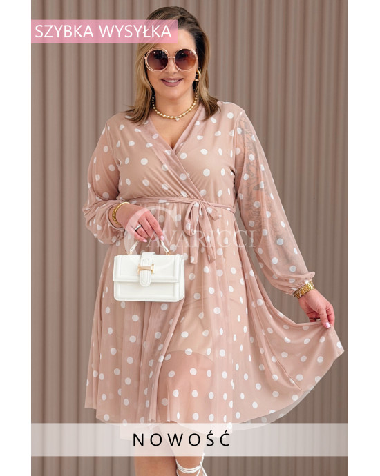 GAIA - Tiulowa sukienka w groszki z ozdobnym paskiem w kolorze caffe