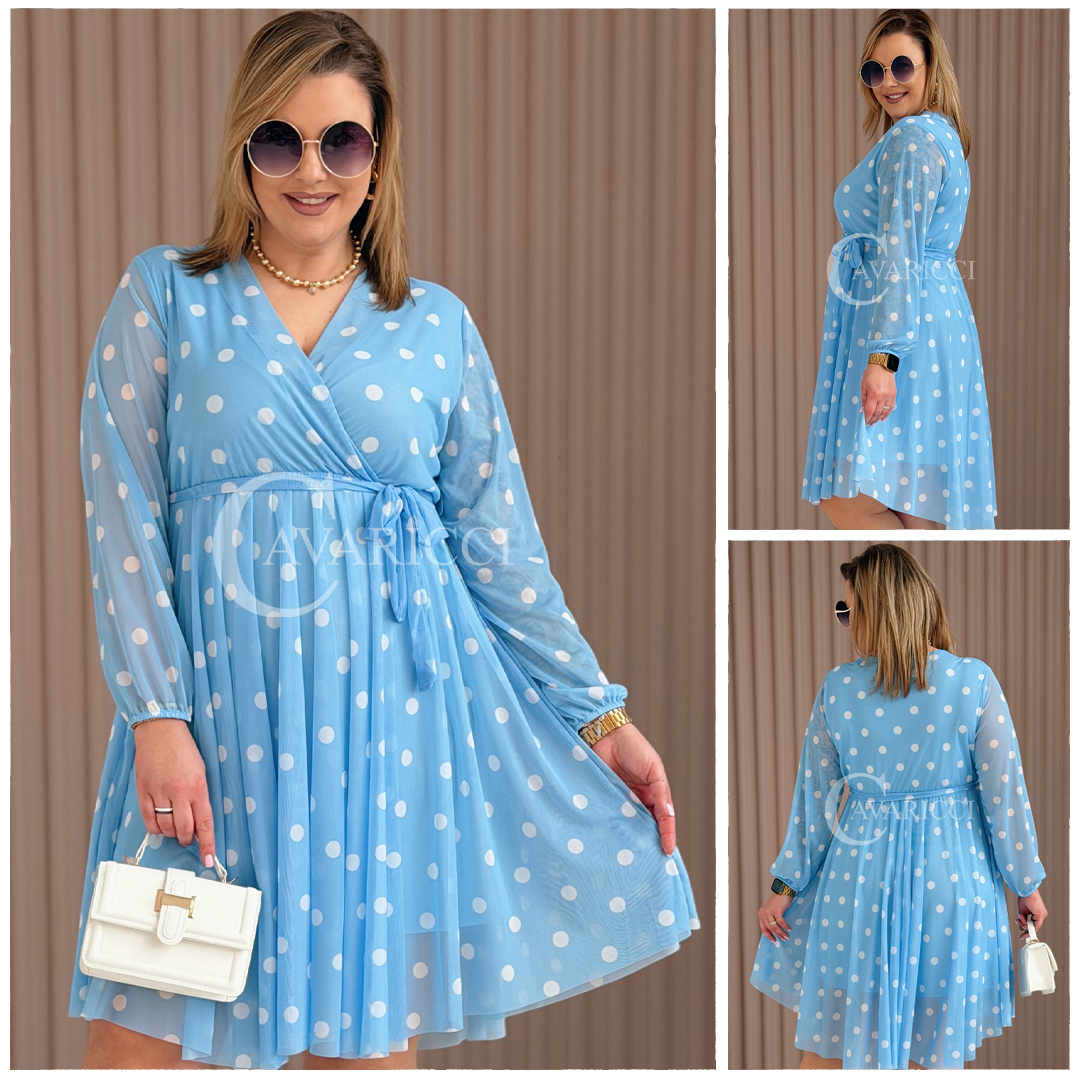 GAIA - Tiulowa sukienka w groszki z ozdobnym paskiem w kolorze błękitnym