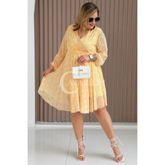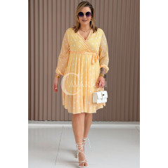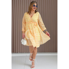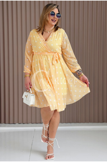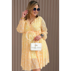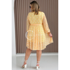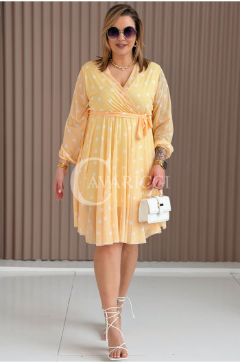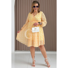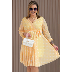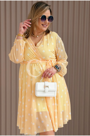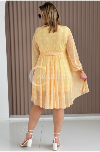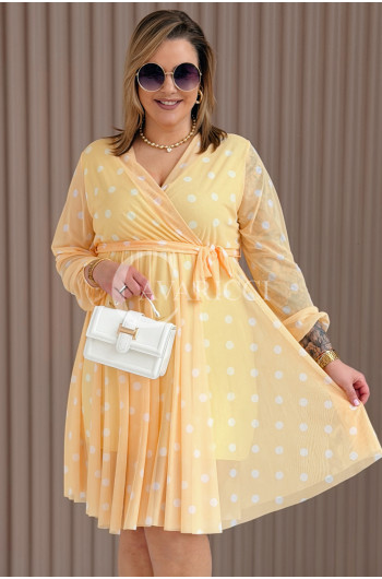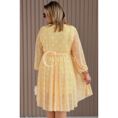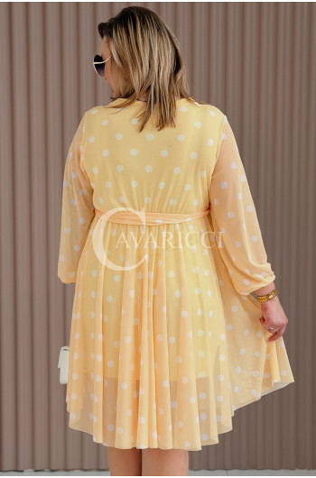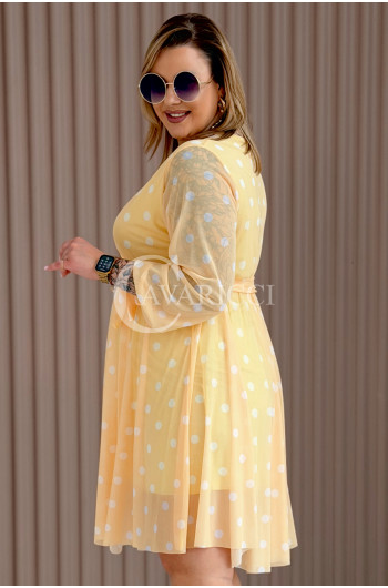 GAIA - Tiulowa sukienka w groszki z ozdobnym paskiem w kolorze żółtym