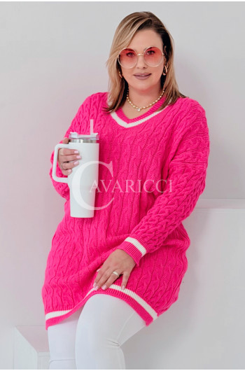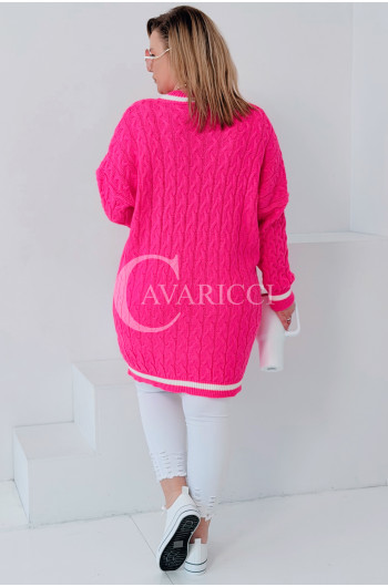 LUVINEVA - Stylowy sweter o długim fasonie z dekoltem w literę V i ozdobnym ściegiem w kolorze landrynkowym