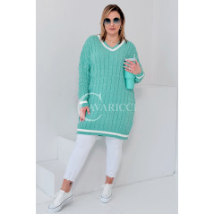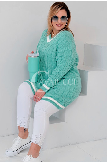 LUVINEVA - Stylowy sweter o długim fasonie z dekoltem w literę V i ozdobnym ściegiem w kolorze miętowym