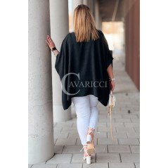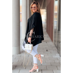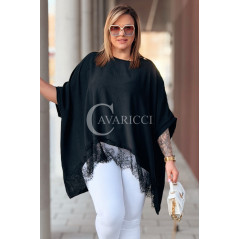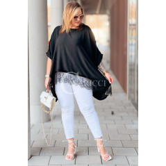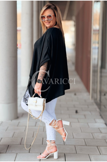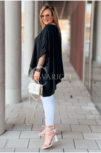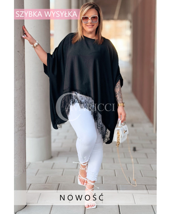 BINA - Modowa oversizowa bluzka wykończenie w koronce w kolorze czarnym