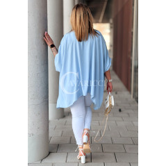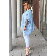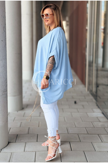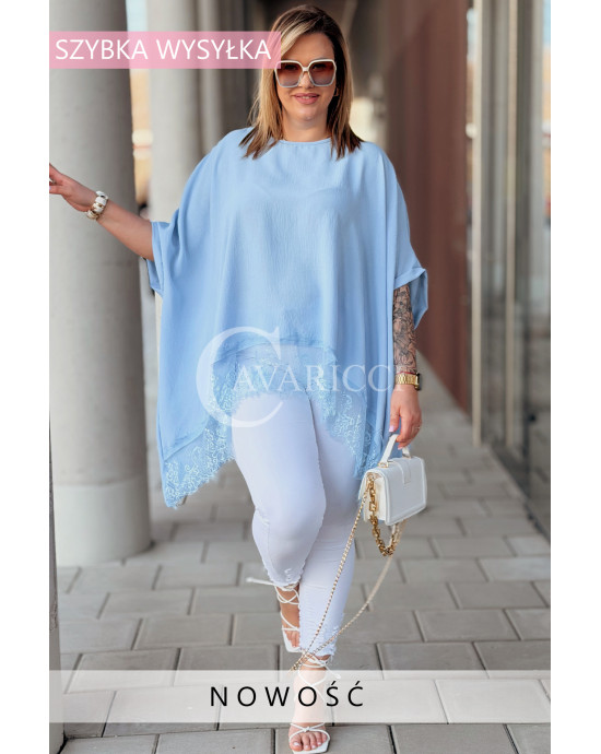 BINA - Modowa oversizowa bluzka wykończenie w koronce w kolorze błękitnym