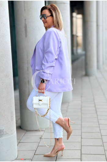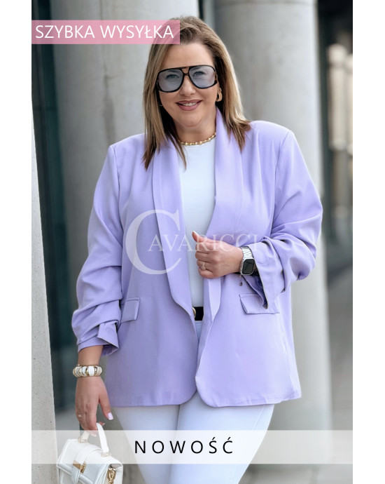 Marynarka LUCREZIA – Otwarty Fason z Marszczonym Rękawem na Podszewce w Kolorze Liliowym