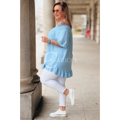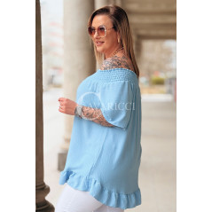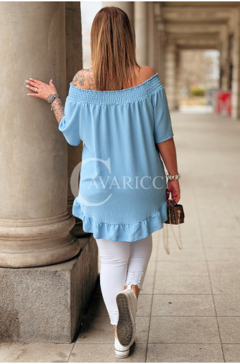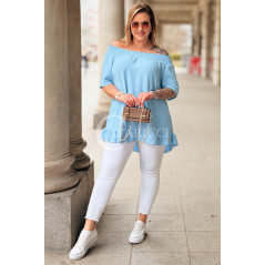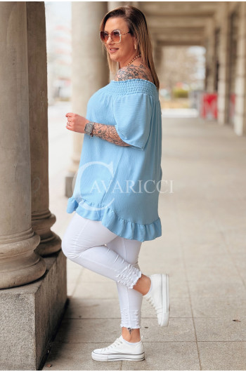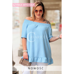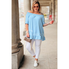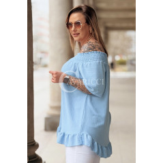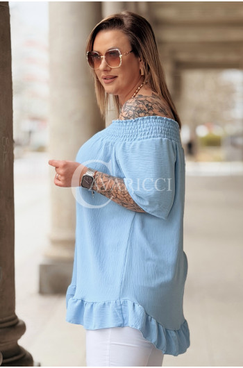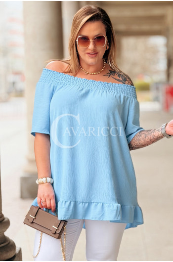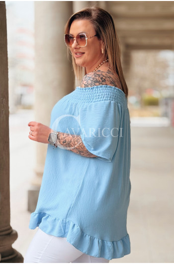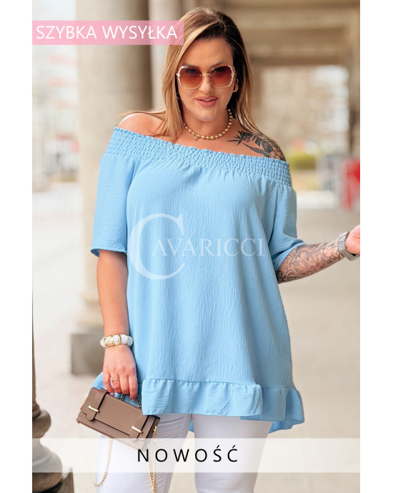 Bluzka BIAGIA – Zwiewna Hiszpanka z Falbaną Maskująca Brzuszek Kolor Błękit