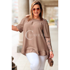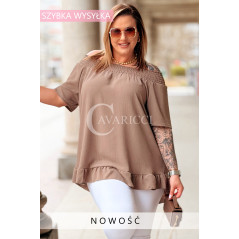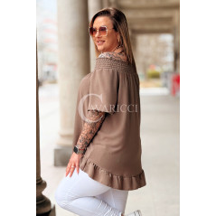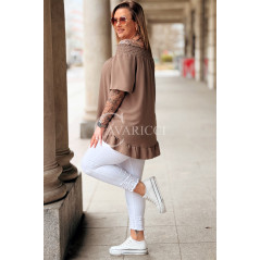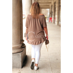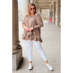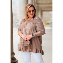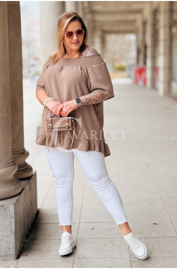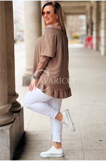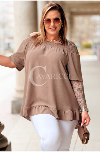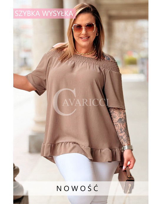 Bluzka BIAGIA – Zwiewna Hiszpanka z Falbaną Maskująca Brzuszek Kolor Fango