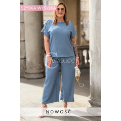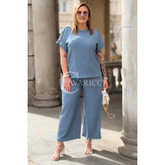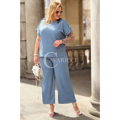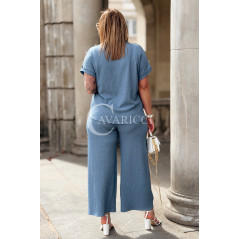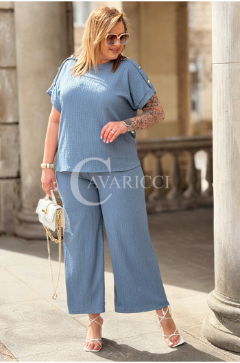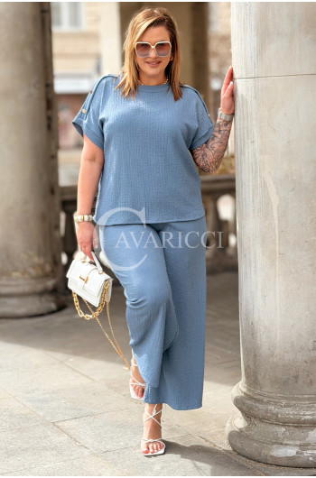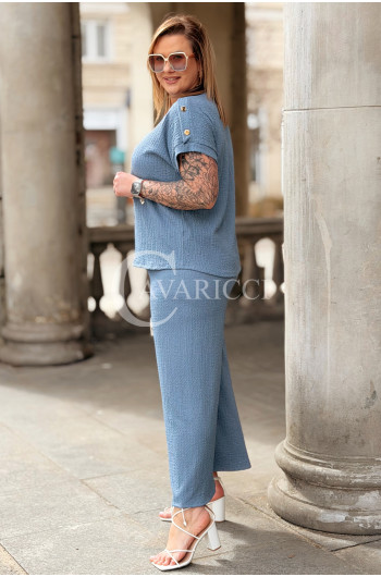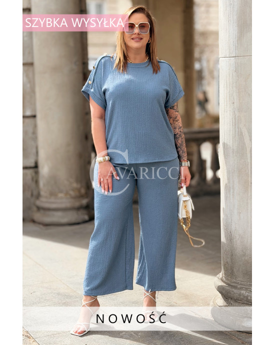 Elegancki Komplet TIRANA – Szerokie Spodnie i Bluzka z Biżuteryjnymi Guzikami Kolor Jeans