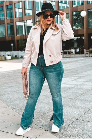 Fason: Krótka, zapinana na duże guziki, z szerokim kołnierzem.
