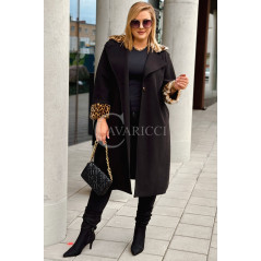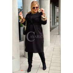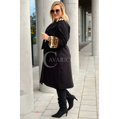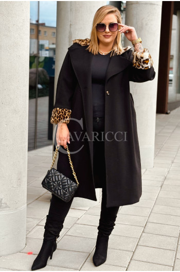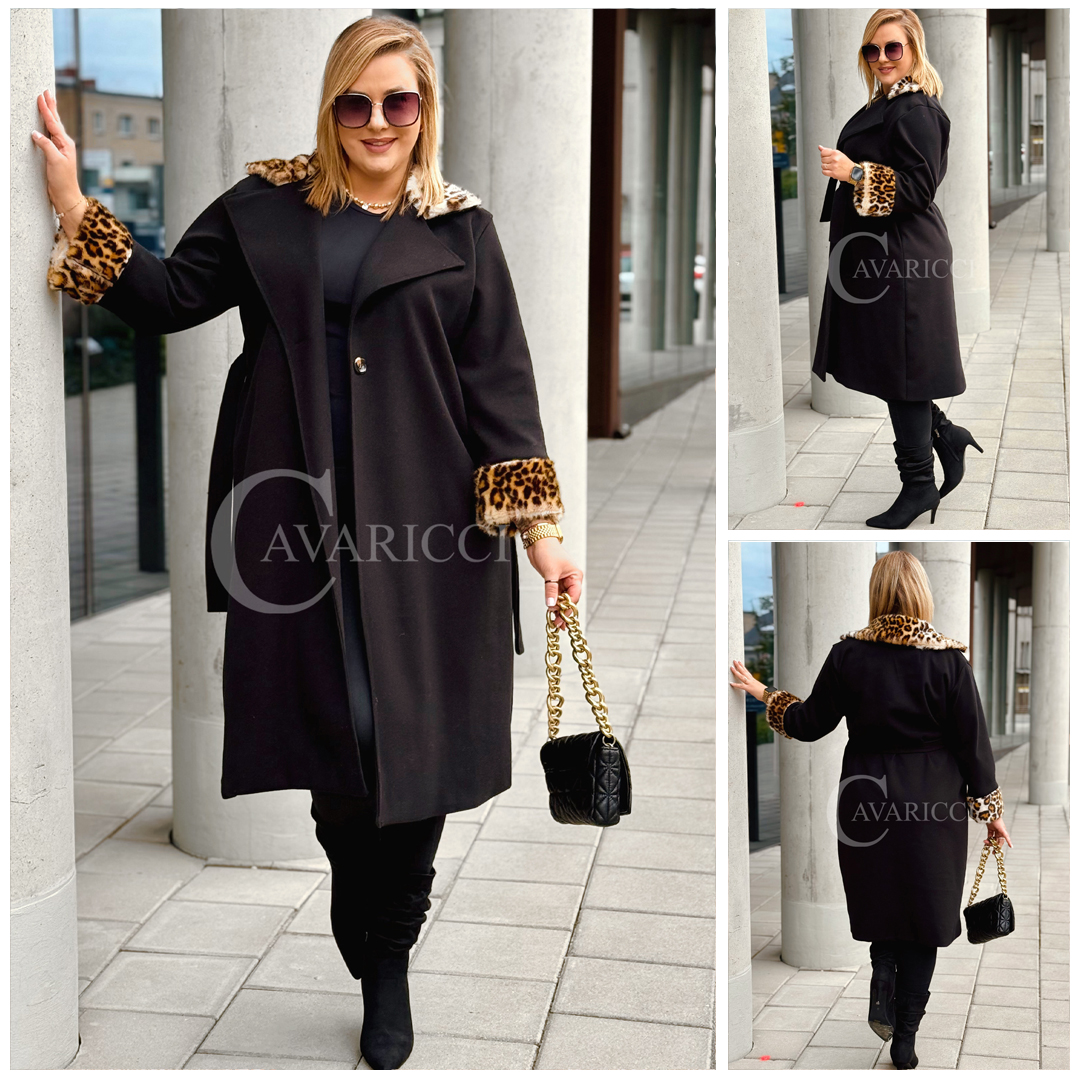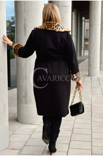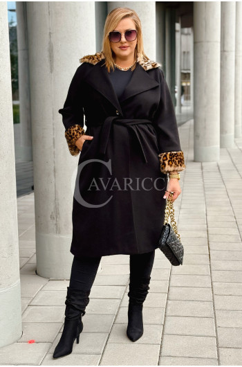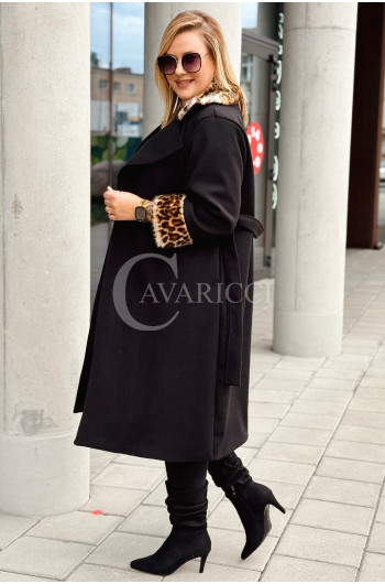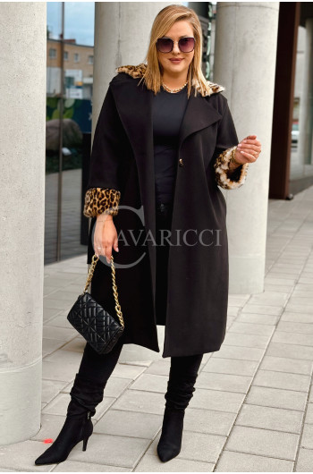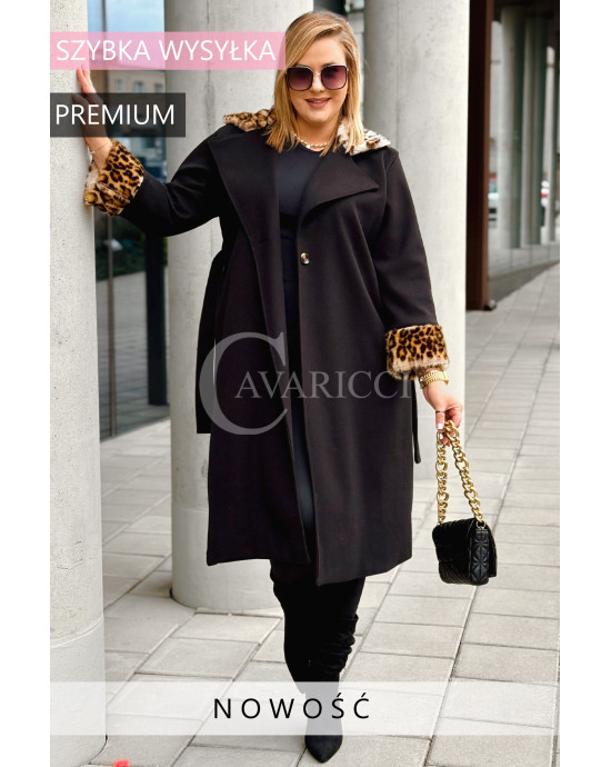 CONSTANZIA - Płaszcz wiązany z panterkowym futerkiem w kolorze czarnym