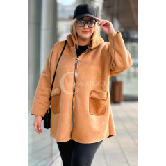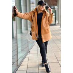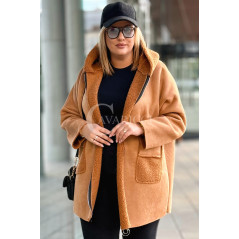 BACOLI - Płaszcz oversize z kapturem i wstawkami boucle w kolorze camelowym