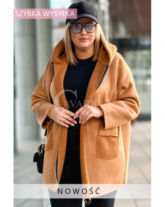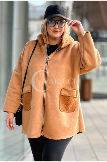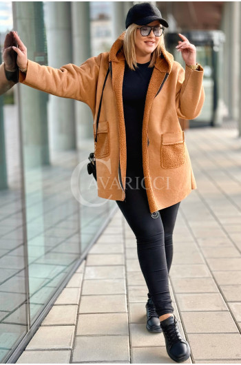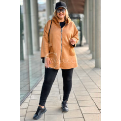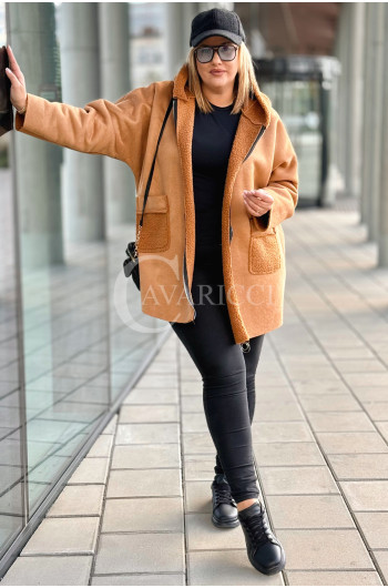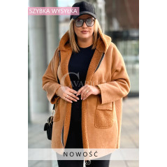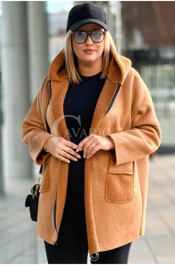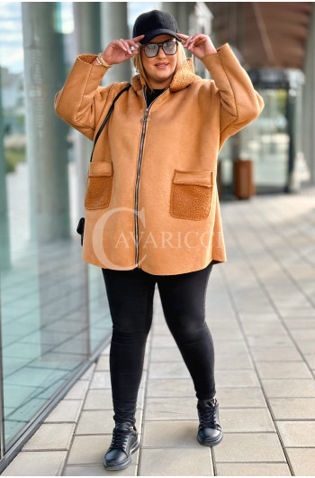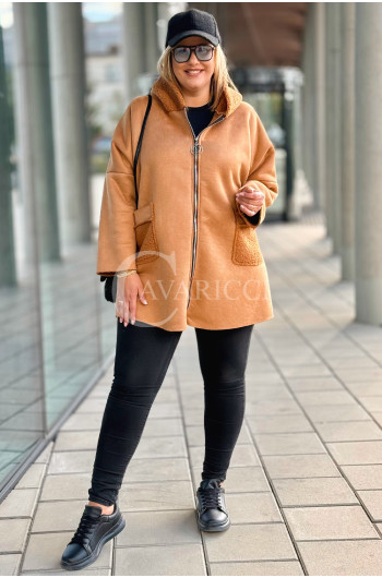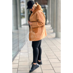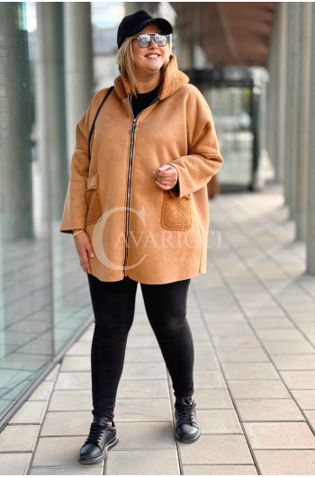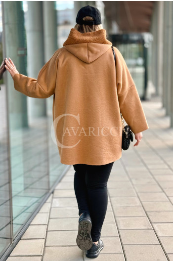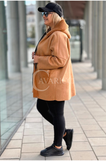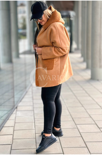 BACOLI - Płaszcz oversize z kapturem i wstawkami boucle w kolorze camelowym