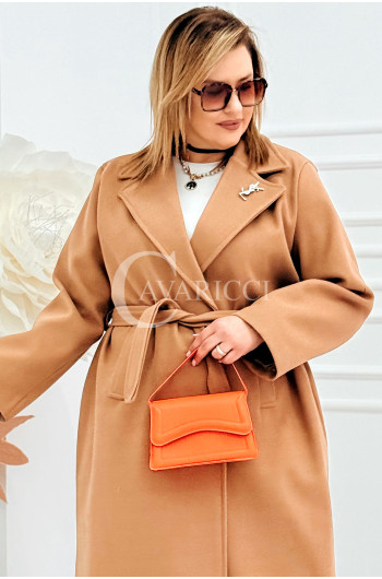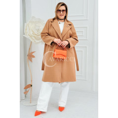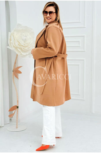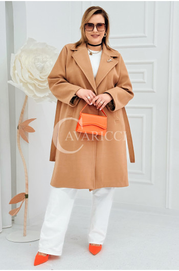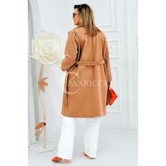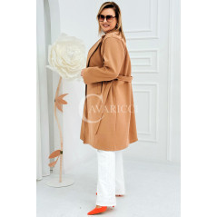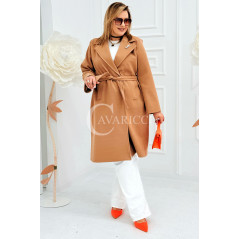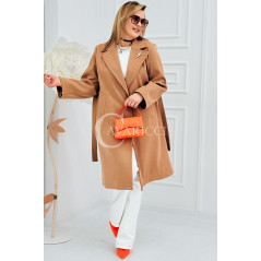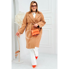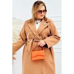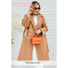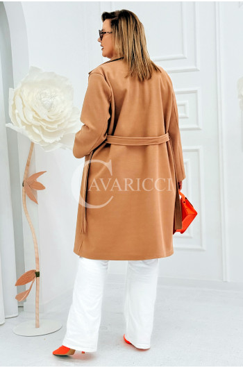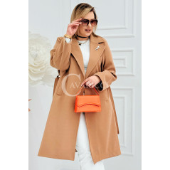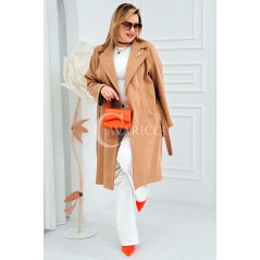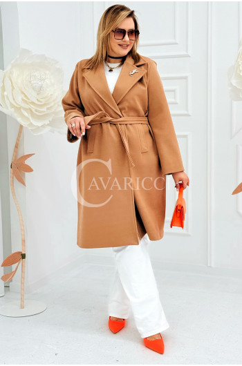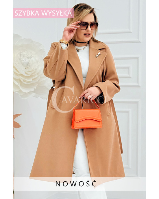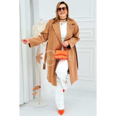 IRIS - Modny płaszcz wiosenny w kolorze cafee z detalem premium broszką