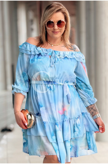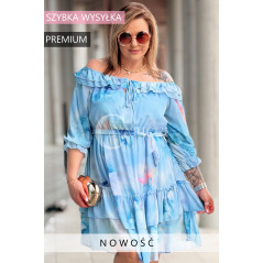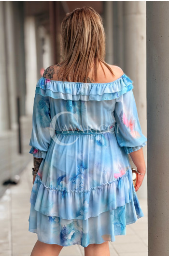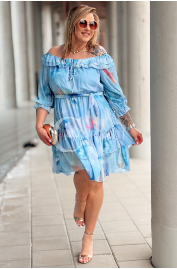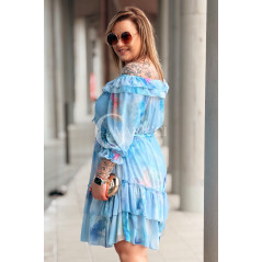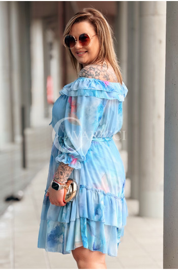 ELISABETH - hiszpanka w kwiaty premium z falbaną nadruk w kolorze błękitnym