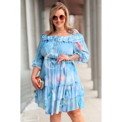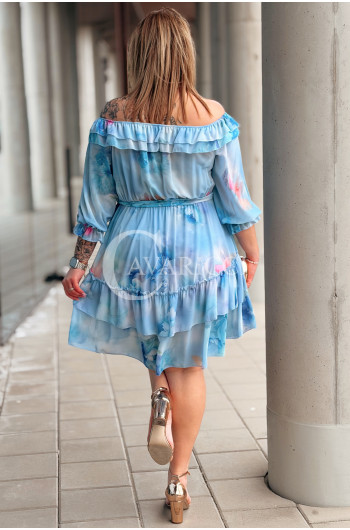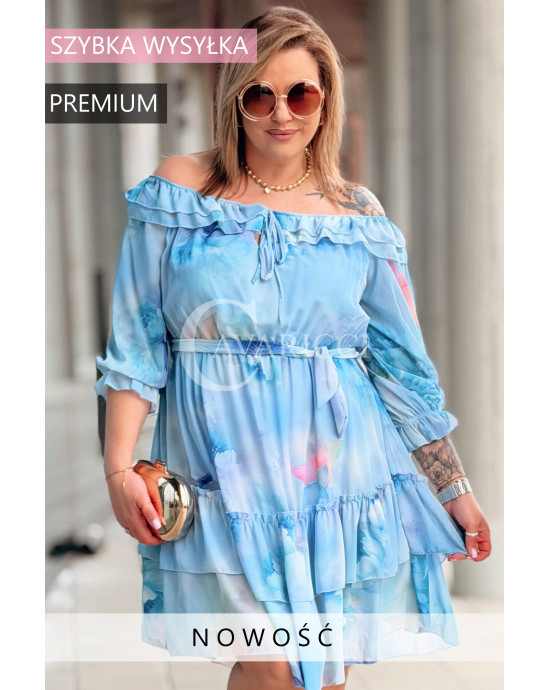 ELISABETH - hiszpanka w kwiaty premium z falbaną nadruk w kolorze błękitnym
