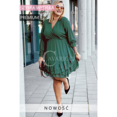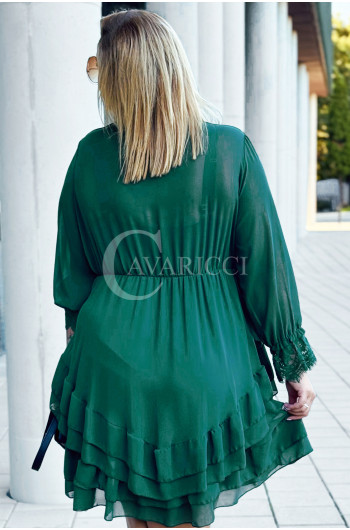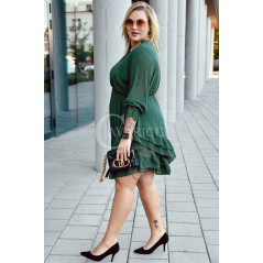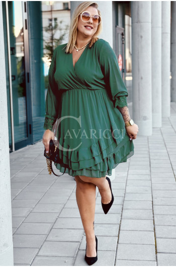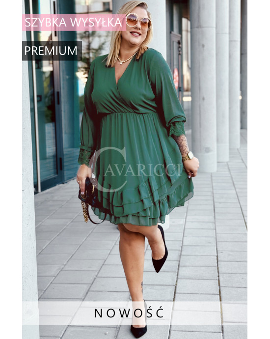 ARKONA - Romantyczna falbaniasta sukienka z długim rękawem wykończonym koronką w kolorze butelkowej zieleni