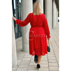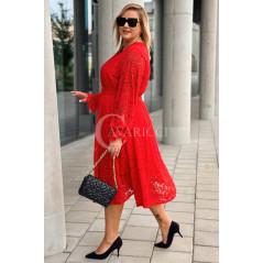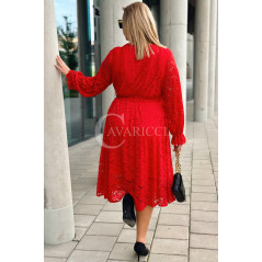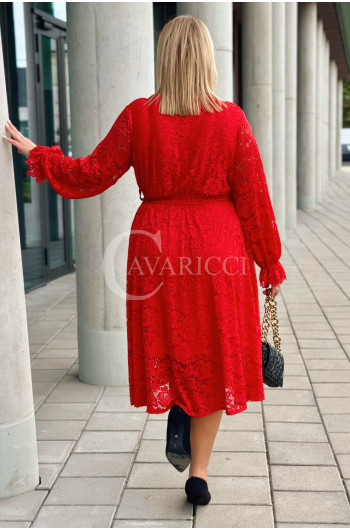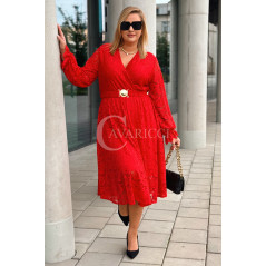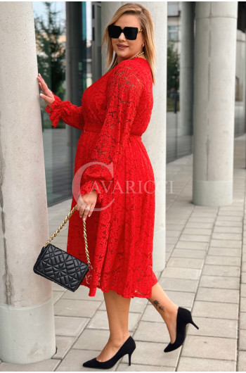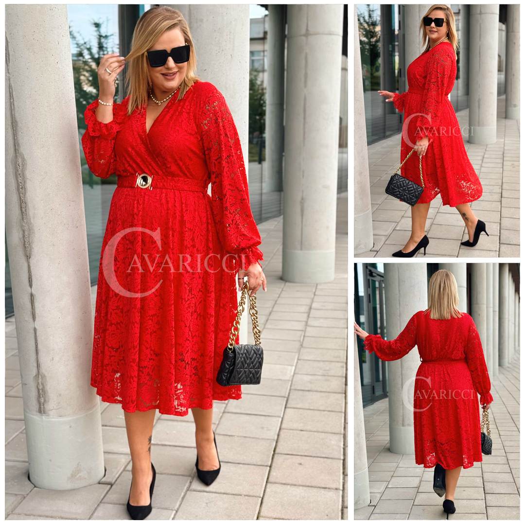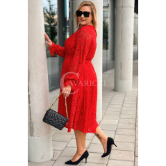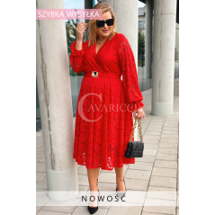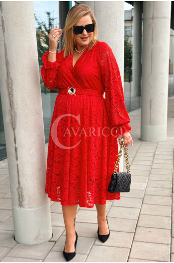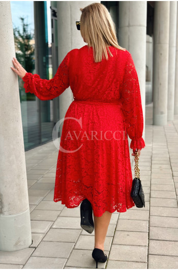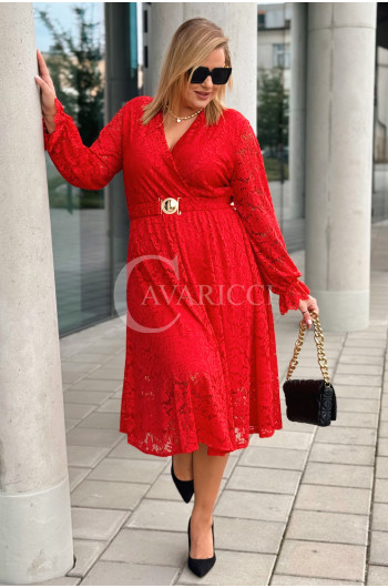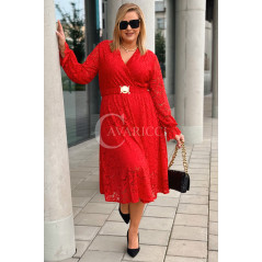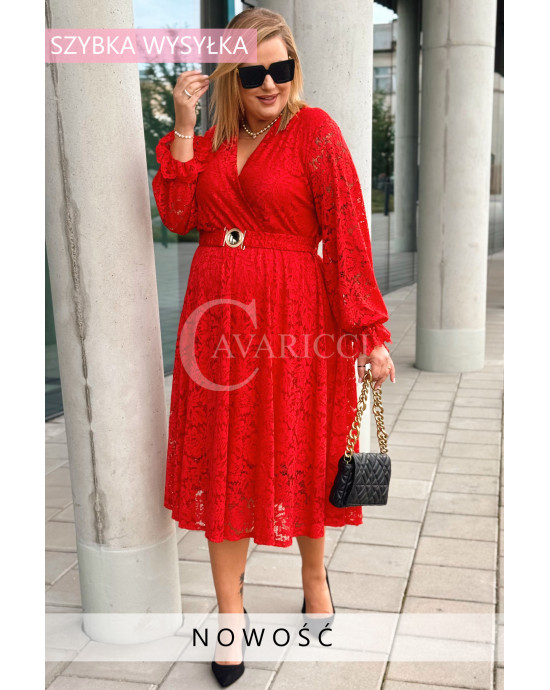 CORTONA - Prosta jesienna sukienka koronkowa z paskiem w kolorze czerwonym