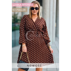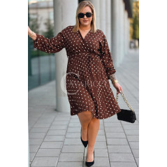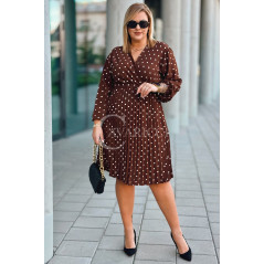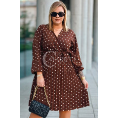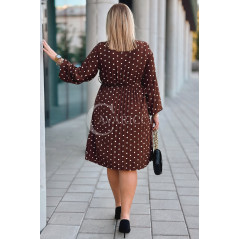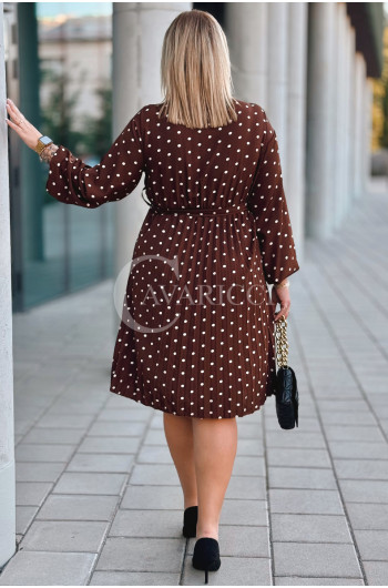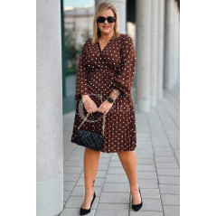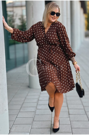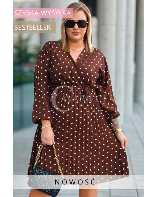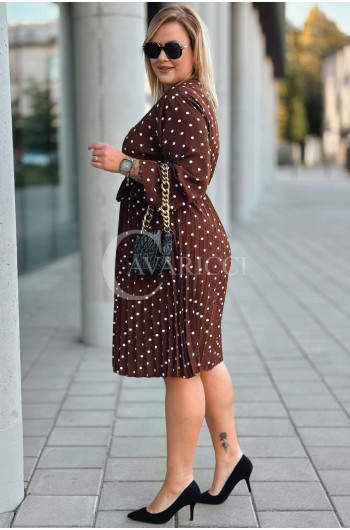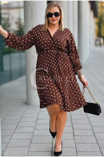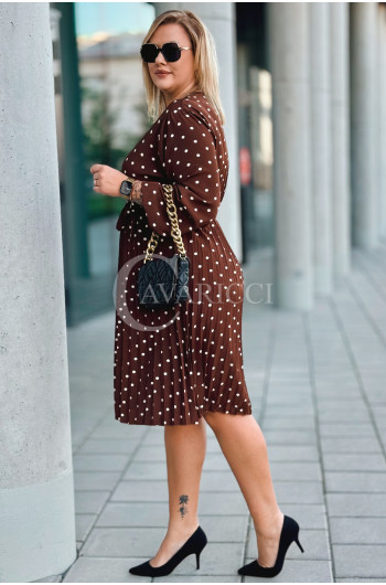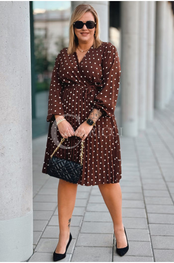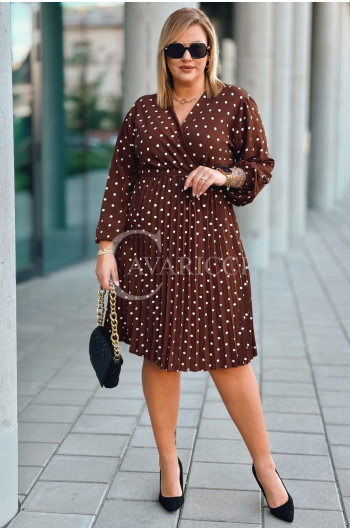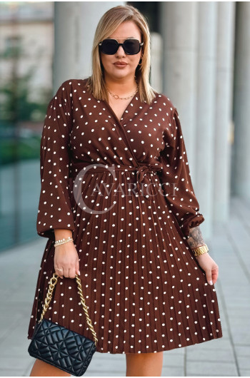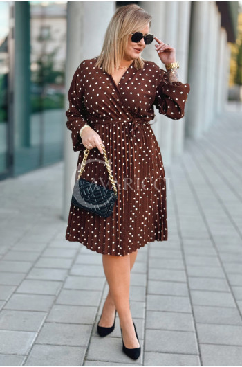 FILIPPA - Plisowana sukienka z długim rękawem i przekładanym dekoltem w groszki w kolorze brązowym