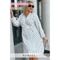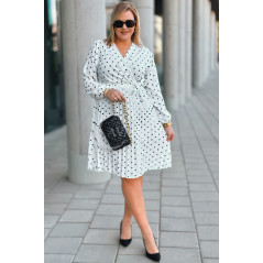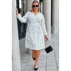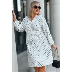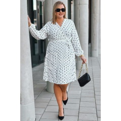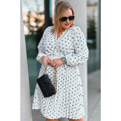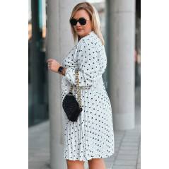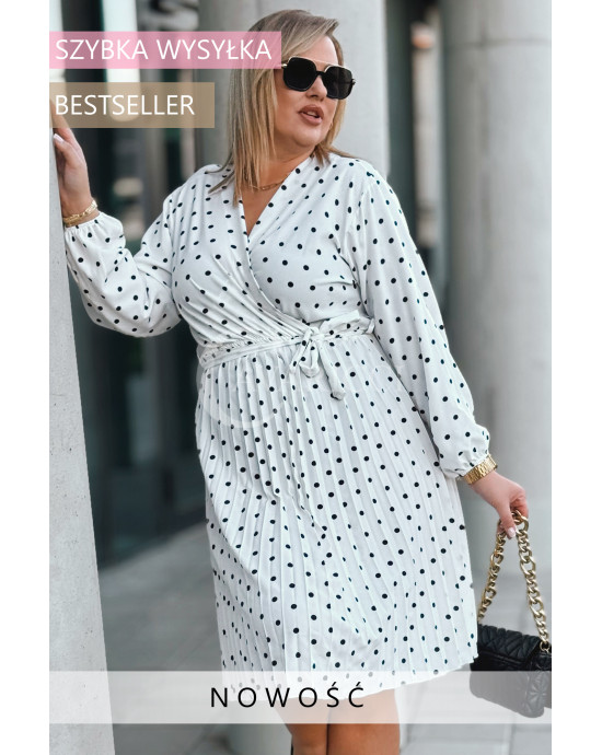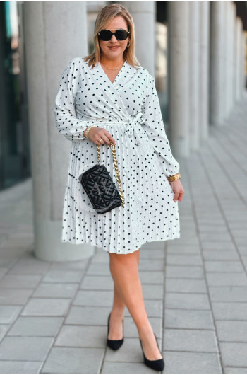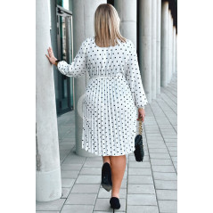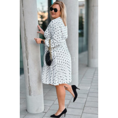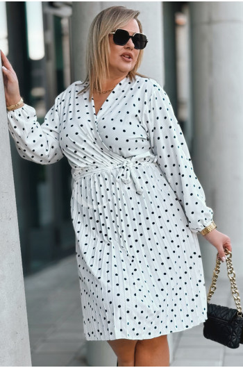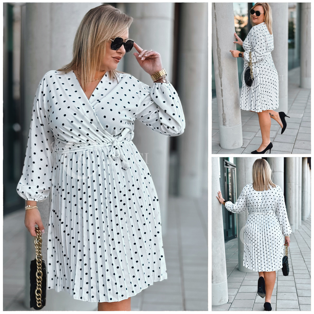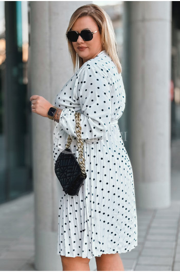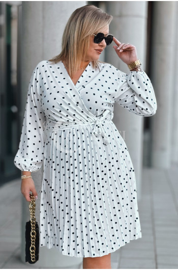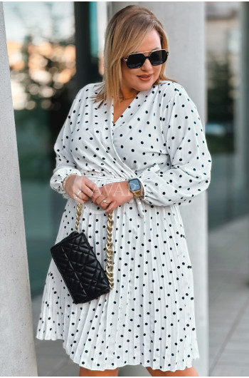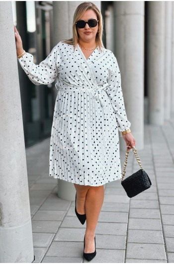 FILIPPA - Plisowana sukienka z długim rękawem i przekładanym dekoltem w groszki w kolorze białym